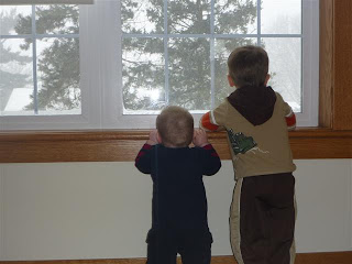 The kids enjoyed watching the snow plows come by yesterday morning and again this morning. The first picture is of them looking out the window at the plows. I don't think Matthew could see very well, but he sure was excited to be standing next to his brother. He's still pretty precarious when standing on his own, so there's always a adult close by, but he is getting steadier each day. He also is getting up on his hands and knees a lot more and I'd put him at about 2 weeks from forward crawling.